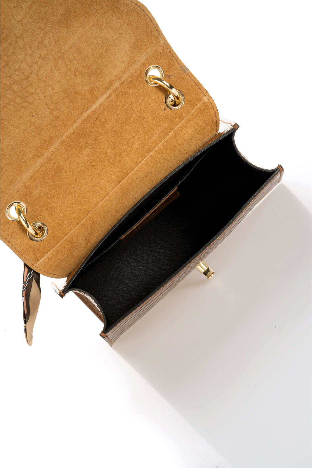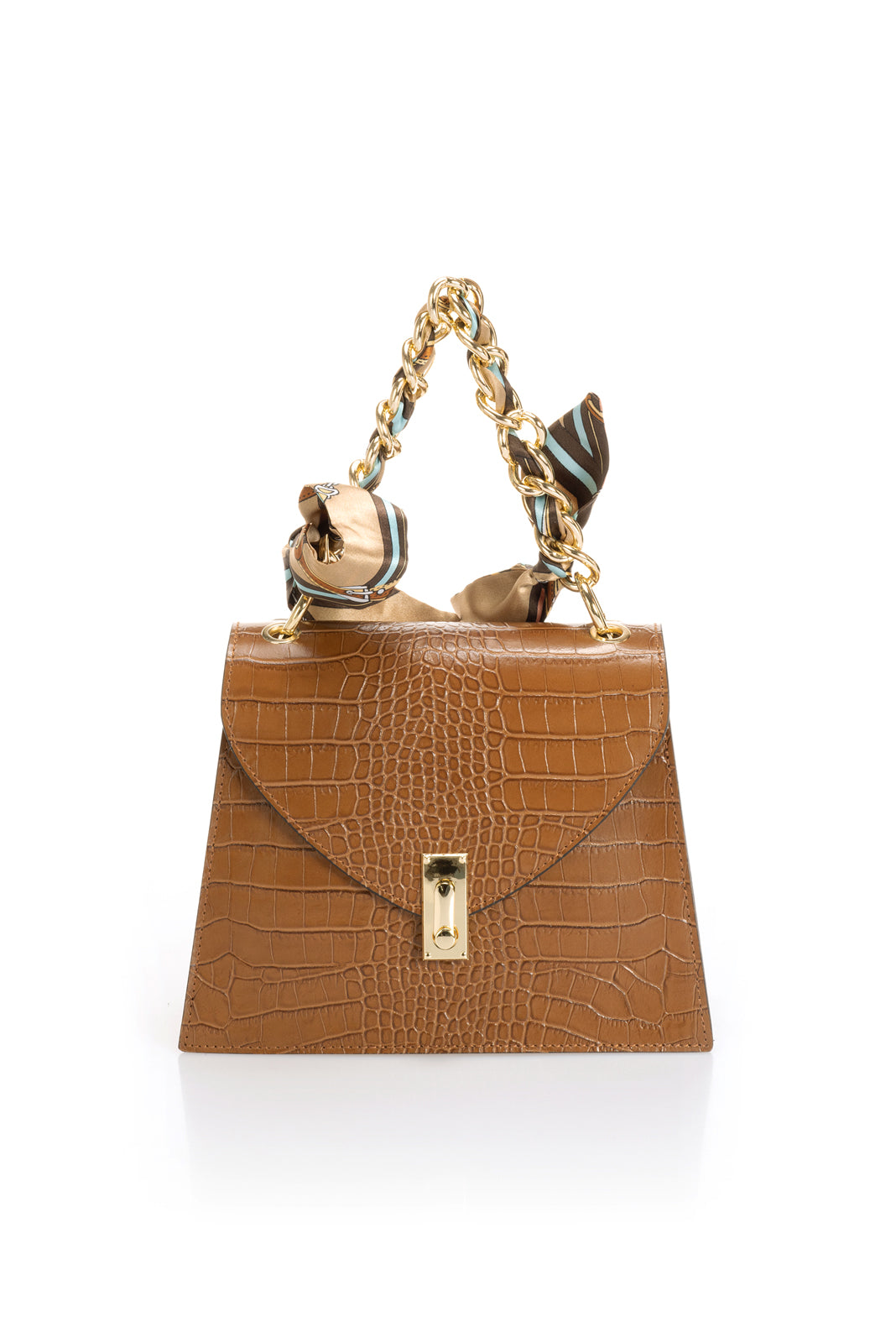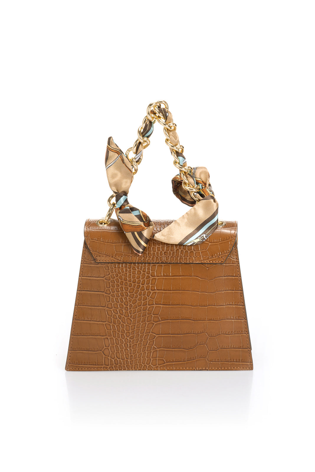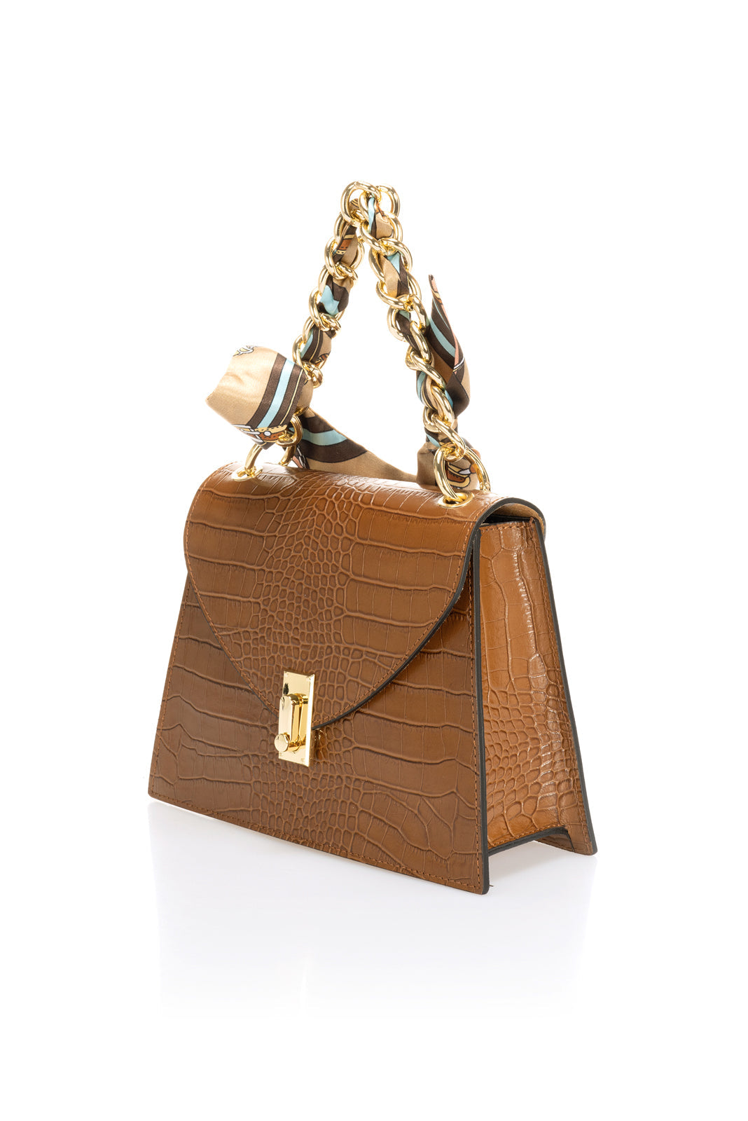 One chain top handle, detachable chai shoulder strap 110 cm, flap over closure, interior pocket.