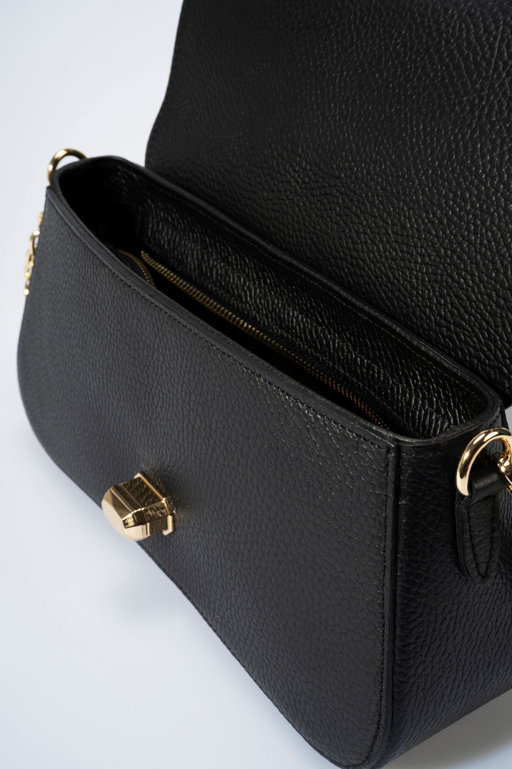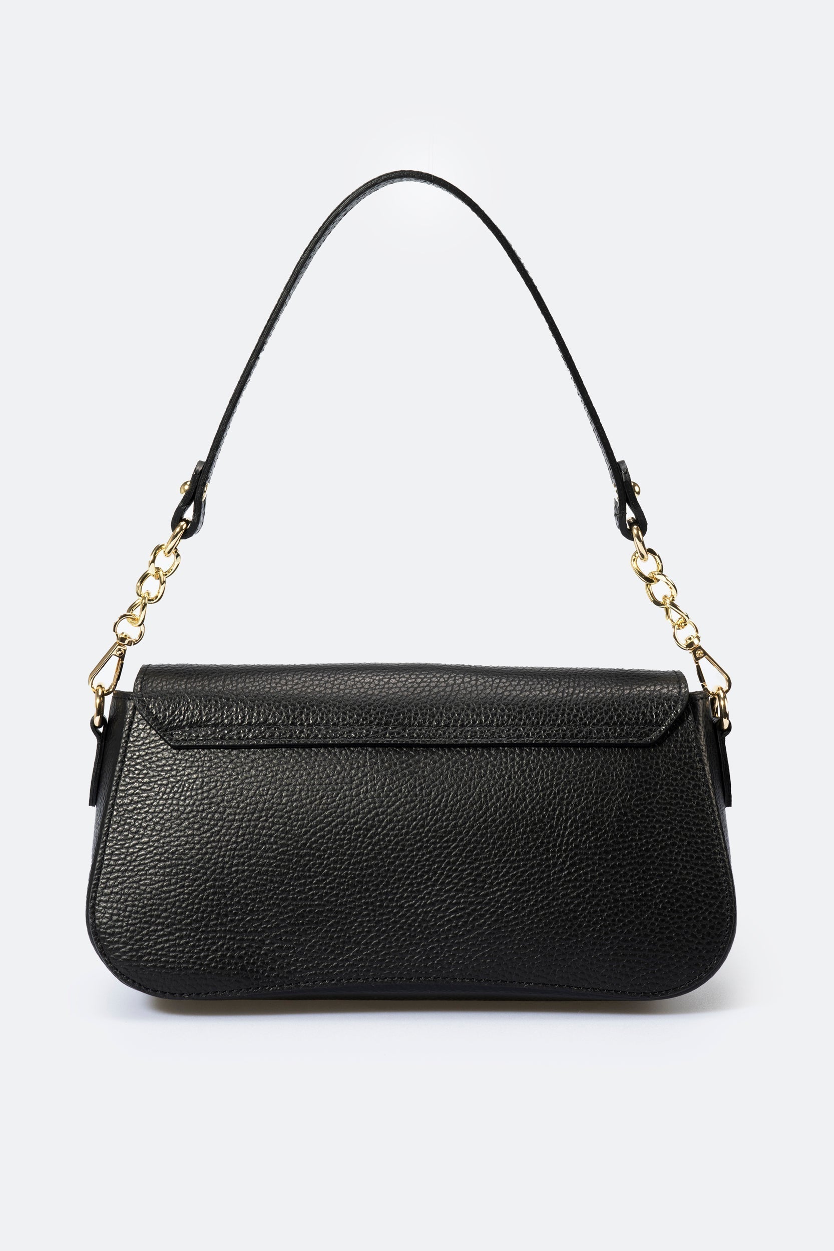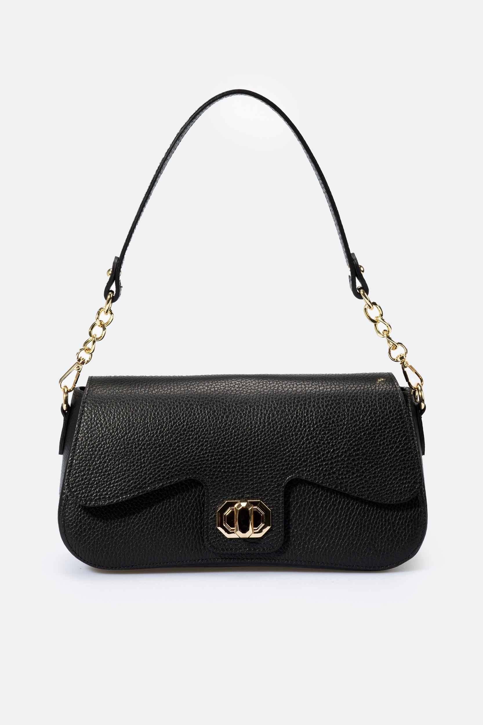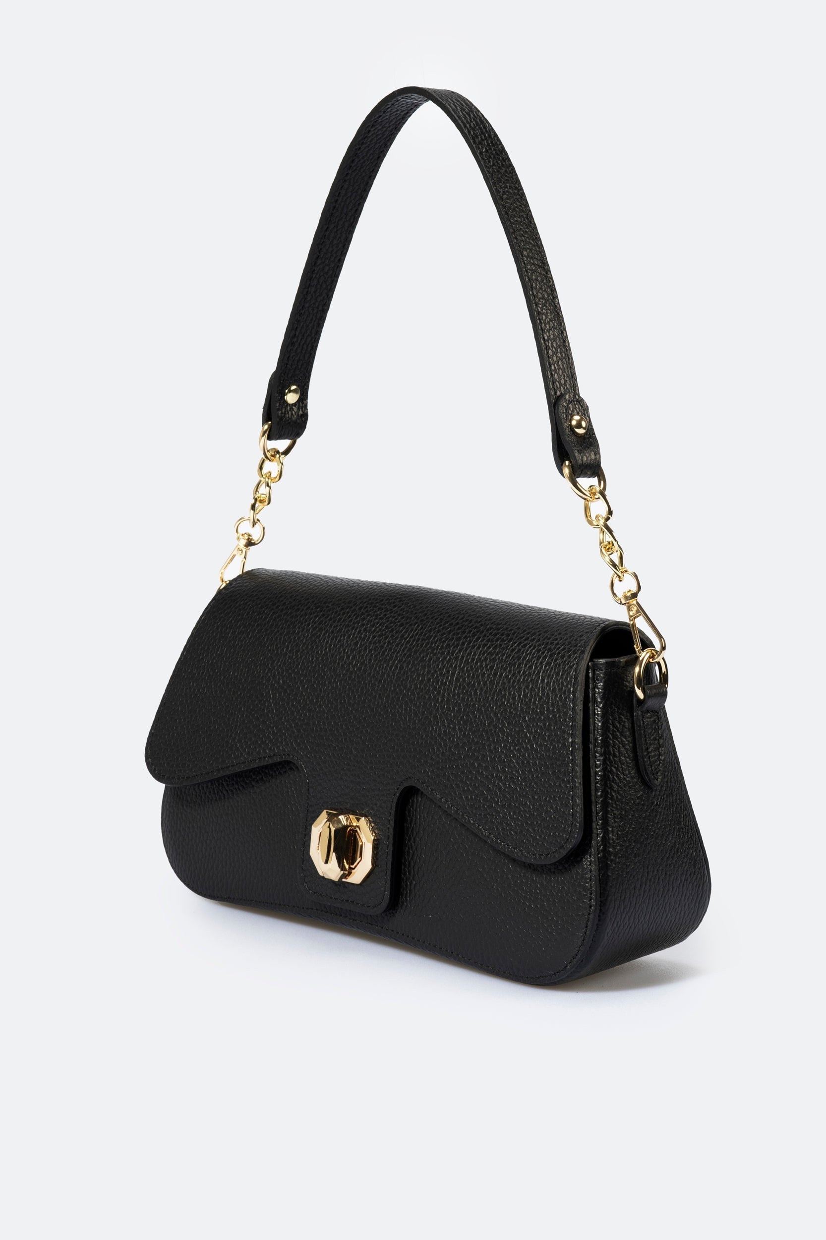 Baguette bag in grain leather. Designed with front flap with twist lock closure, detachable top handle, zip closure, detachable and adjustable shoulder strap, interior zip pocket. A perfect balance between utility and design, the shaped represents a unique and original fashion style. It can be worn with the upper handle or on the shoulder with the strap.