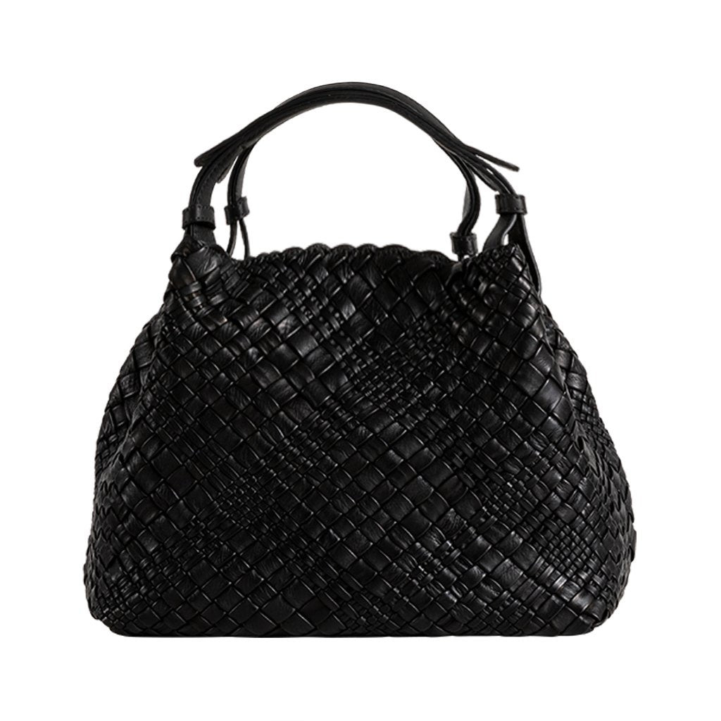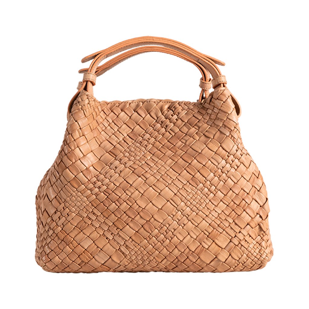 Esmeralda is a woven bag crafted by Plinio VisonC in Vicenza. Made of calfskin leather with the "white chrome" treatment, the bag is woven on white leather then dyed and washed. This gives Esmeralda a natural, yet luxurious look. With a narrow opening and magnetic closure at the top, your belongings will remain secure throughout the day.