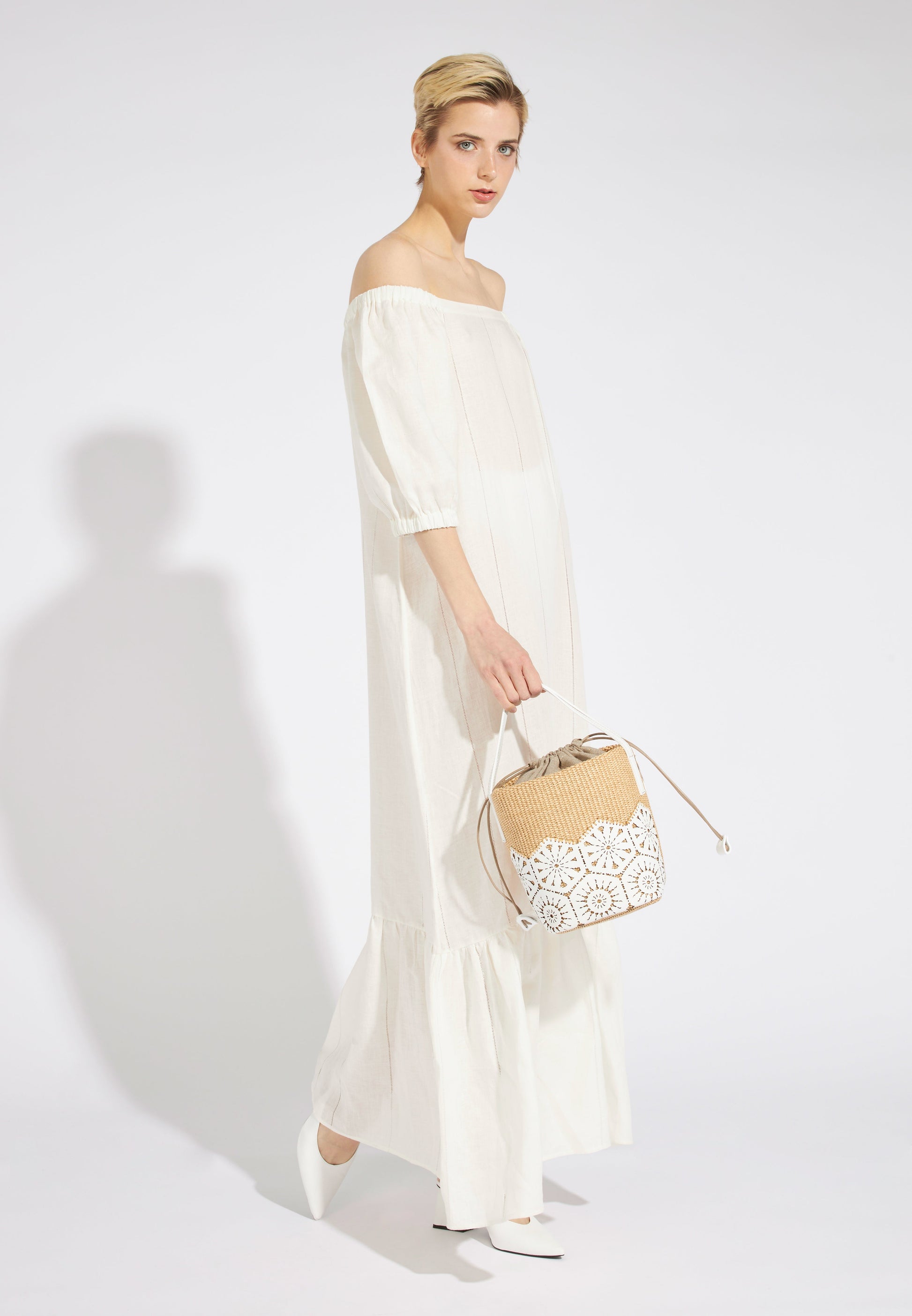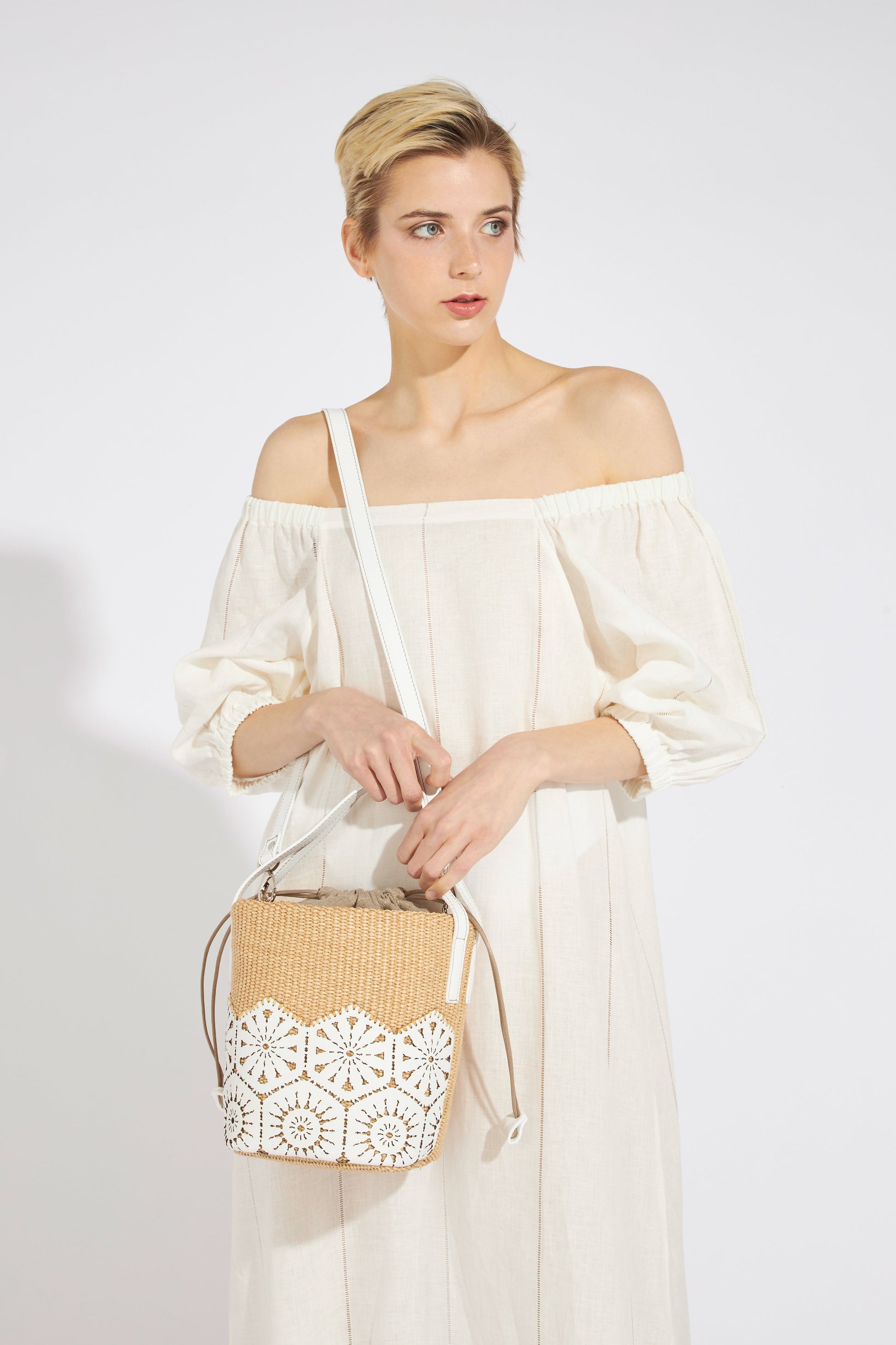 6030 Giulia is a bucket bag composed of calfskin and cotton made by Roberta Gandolfi in Bologna. Raffia-effect fabric bag with laser-worked. Panel hand-stitched sangallo lace on the front.